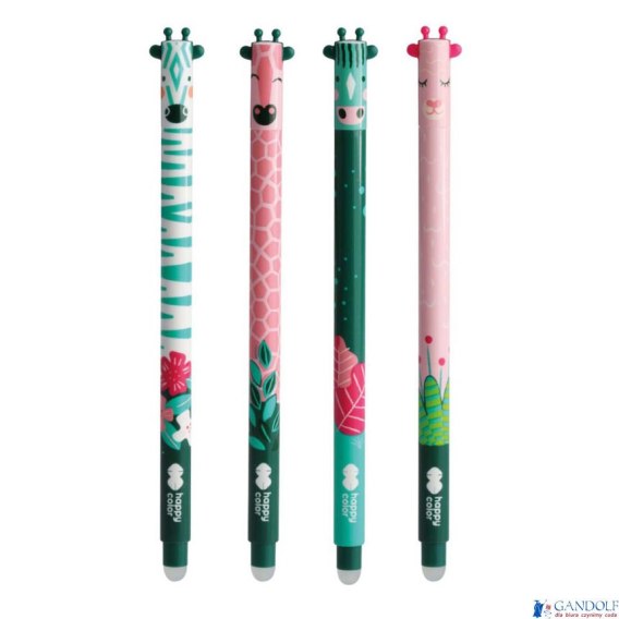 Wymazywalny długopis żelowy w kolorowej obudowie, Dzięki unikalnej formule tuszu napisany tekst można łatwo wymazać, Miękka obudowa typu soft (Uszaki, Aykanki Boho, Jungle), Gumka do wycierania znajduje się na końcu obudowy, Grubość linii pisania: 0,5 mm, Wkład w kolorze niebieskim (Crystal blue), Wymienne wkłady