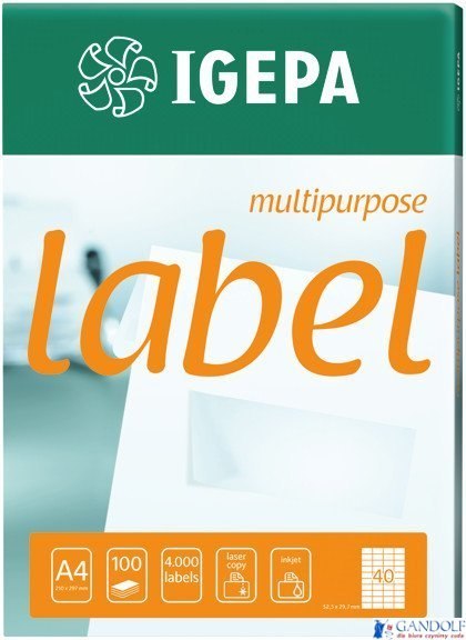 _arkusze formatu A4__możliwość zadruku w drukarkach laserowych,_atramentowych i kserokopiarkach__papier jakości premium o wysokim poziomie bieli__klej permanentny, zapewniający trwałe przyleganie do powierzchni__opakowanie po 100 arkuszy typu _Wrap-around_ umożliwia_wielokrotne zamykanie, co wydłuża żywotność etykiet__bezpłatna aplikacja do przygotowywania etykiet - www.igepa.pl__jednostka sprzedaży 1 opakowanie