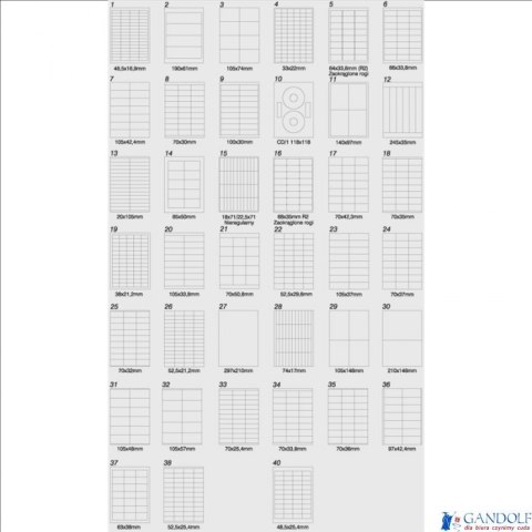 Etykiety samoprzylepne _- dostarczane są na arkuszach o formacie A4 - współpracują ze wszystkimi rodzajami drukarek igłowych, atramentowych i z większością drukarek laserowych (patrz zalecenia producenta) - wopakowaniu 100 arkuszy- dostępne w wersji z tzw.Quatro Clean Technology - tj. z krawędziami bezpieczeństwa, które zapobiegają odkładaniu się kleju na mechanizmie drukarki _- jednostka sprzedaży 1 opakowanie