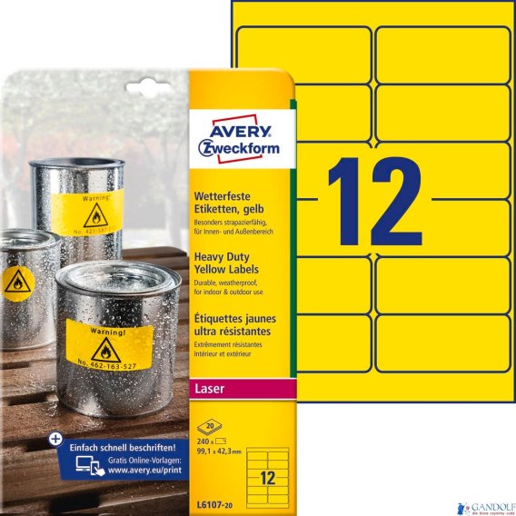 Etykiety AVERY ZWECKFORM Heavy Duty A4, 20 ark./op., 99,1 x 42,3 mm, żółte, poliestrowe |