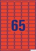 Technologia druku:•INK JET: Tak•LASER: Tak•LASER COLOR: Tak•KSERO: TakCechy produktu:•Rozmiar etykiety (mm): 38,1x21,2•Etykiet / arkusz: 65•Arkuszy/ opakowanie: 20•Etykiet/ opakowanie: 1300•Kolor: czerwone•Format: A4•Rzędów/ arkusz: 5x13•Certyfikaty: FSC