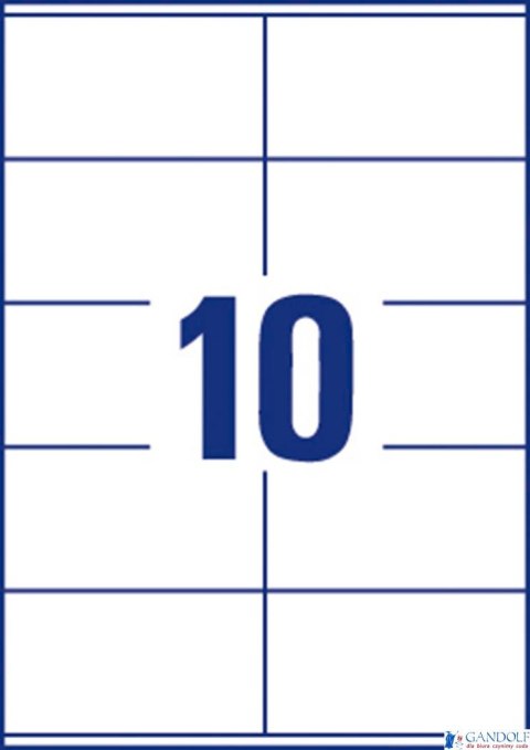 Technologia druku:•INK JET: Tak•LASER: Tak•LASER COLOR: Tak•KSERO: TakCechy produktu:•Rozmiar etykiety (mm): 105 x 57•Etykiet / arkusz: 10•Arkuszy/ opakowanie: 100•Etykiet/ opakowanie: 1000•Kolor: białe•Format: A4•Rzędów/ arkusz: 2x5