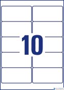 Technologia druku:•INK JET: Tak•LASER: Tak•LASER COLOR: Tak•KSERO: TakCechy produktu:•Rozmiar etykiety (mm): 96 x 50,8•Etykiet / arkusz: 10•Arkuszy/ opakowanie: 30•Etykiet/ opakowanie: 300•Kolor: białe•Format: A4•Rzędów/ arkusz: 2x5•Certyfikaty: FSC