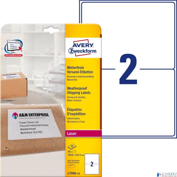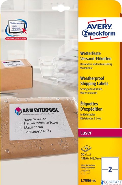 • Etykiety wysyłkowe 199,6x143,5 mm odporne na zmiany pogodowe (25 ark.), Avery Zweckform L7966-25