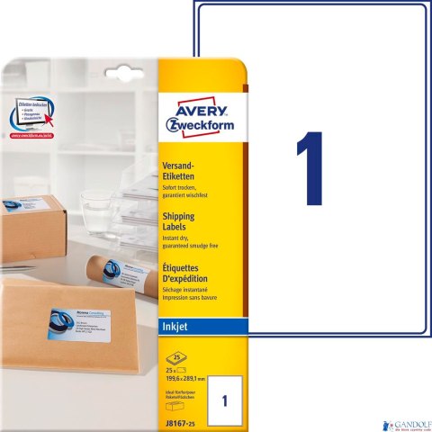 • Etykiety wysyłkowe J8167-25 199,6 x 289,1 25ark. białe Avery Zweckform (X)