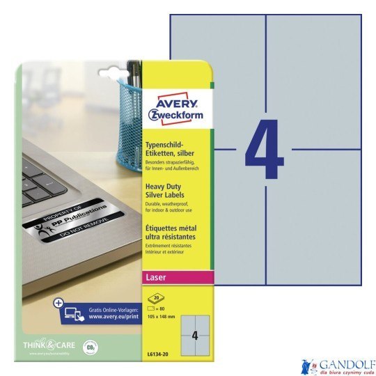 Technologia druku:•LASER: TakCechy produktu:•Rozmiar etykiety (mm): 105 x 148•Etykiet / arkusz: 4•Arkuszy/ opakowanie: 20•Etykiet/ opakowanie: 80•Kolor: srebrne•Format: A4•Rzędów/ arkusz: 2x2