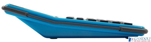 Wodoodporny kalkulator z 12-cyfrowym wyświetlaczem_podwójny system zasilania (bateria słoneczna i baterie)_stały kąt nachylenia wyświetlacza_wymiar: 152x105x38mm_funkcja pierwiastka kwadratowego, obliczania procentów, sumy łącznej oraz podatku_wyposażony w klawisz zmiany znaku oraz podwójnego zera_wyłącza się automatycznie_2 lata gwarancji_kolor: niebieski