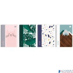 Pojedyncza spirala wkręcana. Otwory do segregatora. Perforacja wzdłuż grzbietu, ułatwiająca wyrywanie kartek. Spirala po długim boku. Lakierowane elementy na okładce.