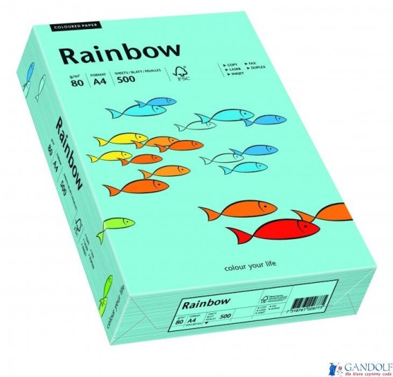 Papier kolorowy Rainbow morski 84_- Wysokiej jakości, kolorowy papier, bezdrzewny, barwiony w masie, o szerokim wachlarzu kolorystycznym. Zalecany do wydruków faksowych, korespondencji oraz zaproszeń i ulotek. Pakowany w eleganckie przezroczyste opakowanie. A4 80 g kolor pastelowy_- jednostka sprzedaży 1 ryza