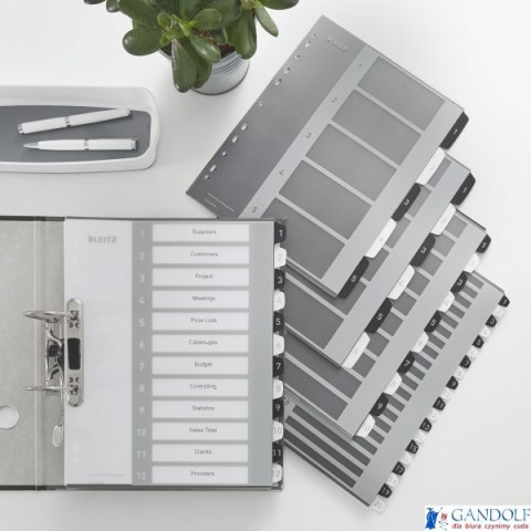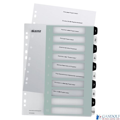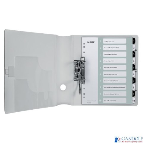 Wydrukuj elegancki i ekskluzywny spis treści za pośrednictwem www.leitz.com/easyprint_Mocne i trwałe, z wytrzymałego polipropylenu o grubości 0,3 mm_Format A4 Maxi pozwala na szybki dostęp do dokumentów, nawet w przypadku, gdy są włożone do koszulek_10 przekładek numerycznych 1-10 ułatwiających sortowanie_11 uniwersalnych dziurek umożliwiających wpinanie do segregatora