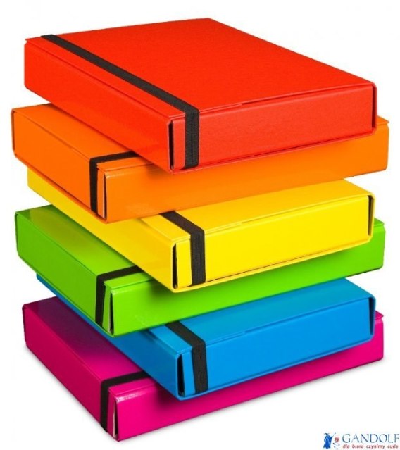 Teczka typu Box, o szerokości grzbietu 5 cm, wykonana z twardej 2mm tektury powleczonej folią PP. Posiada czarną wyklejkę z wysokiej jakości surowca. Zamykana na gumkę._ Innowacyjna gama kolorystyczna