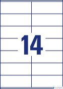 Technologia druku:•INK JET: Tak•LASER: Tak•LASER COLOR: Tak•KSERO: TakCechy produktu:•Rozmiar etykiety (mm): 105 x 41•Etykiet / arkusz: 14•Arkuszy/ opakowanie: 100•Etykiet/ opakowanie: 1400•Kolor: białe•Format: A4•Rzędów/ arkusz: 2x7•Certyfikaty: FSC