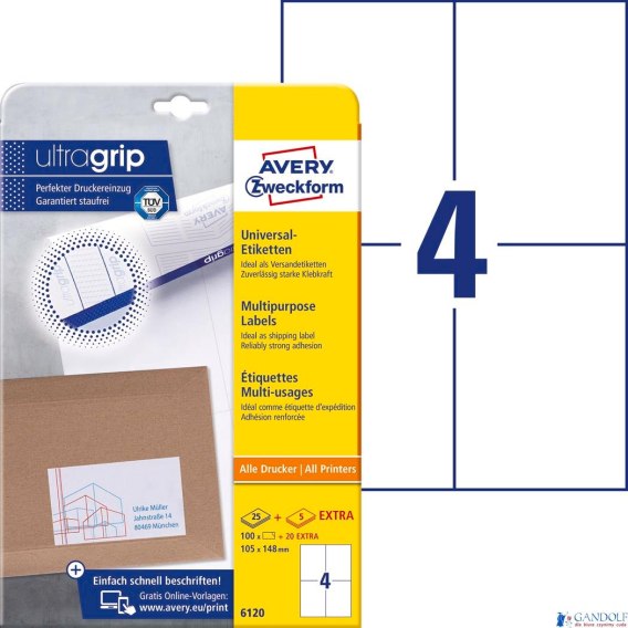 Trwałe etykiety uniwersalne 6120 105x148 30ark. białe, Avery Zweckform |