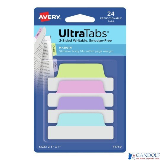 • Ultra Tabs - samoprzylepne zakładki indeksujące, kolorowe, pastelowe, 63,5x25, 24 szt., Avery Zweckform 74769