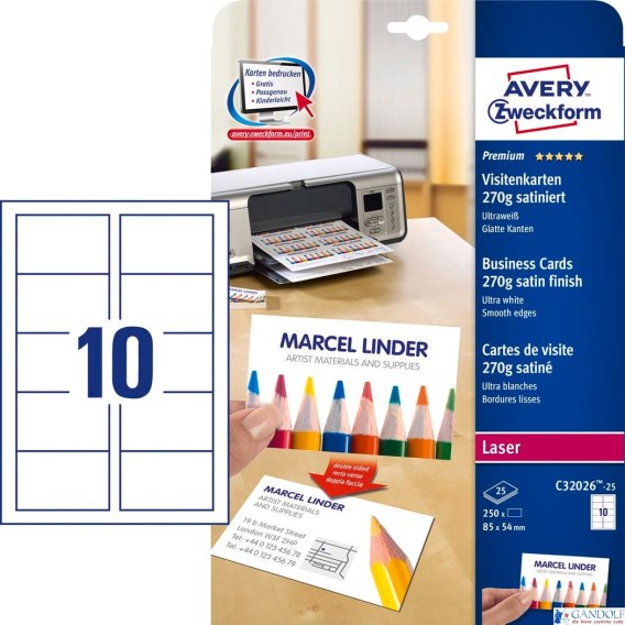 • Wizytówki Quick&Clean C32026-25 85x54 mm 25 ark. 250 szt., 270 g, satynowane, śnieżnobiałe, Avery Zweckform (X)