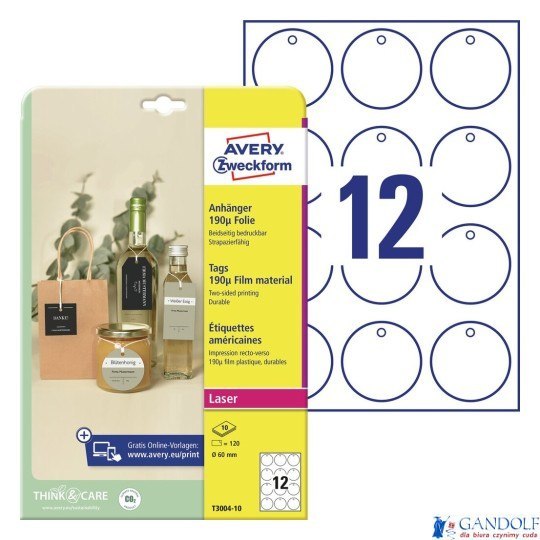 Zawieszki foliowe Avery Zweckform, 190_, 60 mm, okrągłe, 10 ark. T3004-10