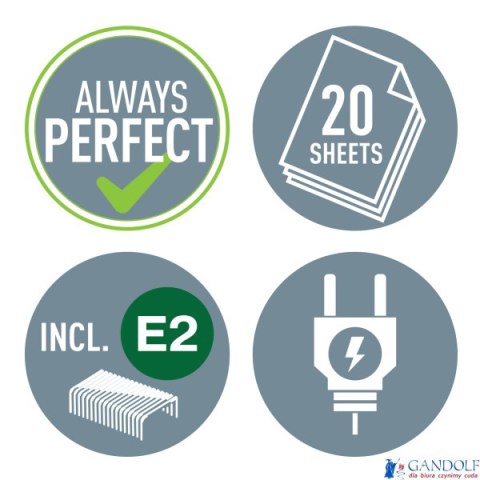 Idealny do częstego użycia. Dziurkuje do 20 kartek. Zasilany prądem (zasilacz w komplecie). Na e-zszywki Leitz, które nie zacinają się podczas zszywania. 3 lata gwarancji przy używaniu zszywek Leitz.